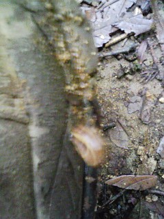 登山道で湿った枯葉にひょいと足を乗せると1cmくらいの糸のように細い奴から