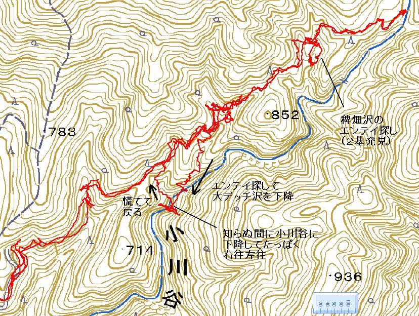 小川谷を渡ってからの軌跡を拝見すると、「稗畑沢支流コース」の